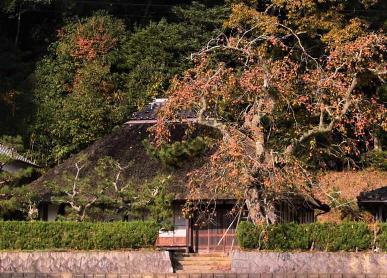 (作品に込めた思い:数年前、茅葺き屋根が珍しく、油彩画の材料に写真を撮りました。葺き替え直後は白っぽい屋根でしたが、その後どうなっているかと気になり、行ってみました。歴史を感じる茅葺き屋根と、たわわに実った柿もとても珍しいので、是非残して欲しくて作品にしました。)