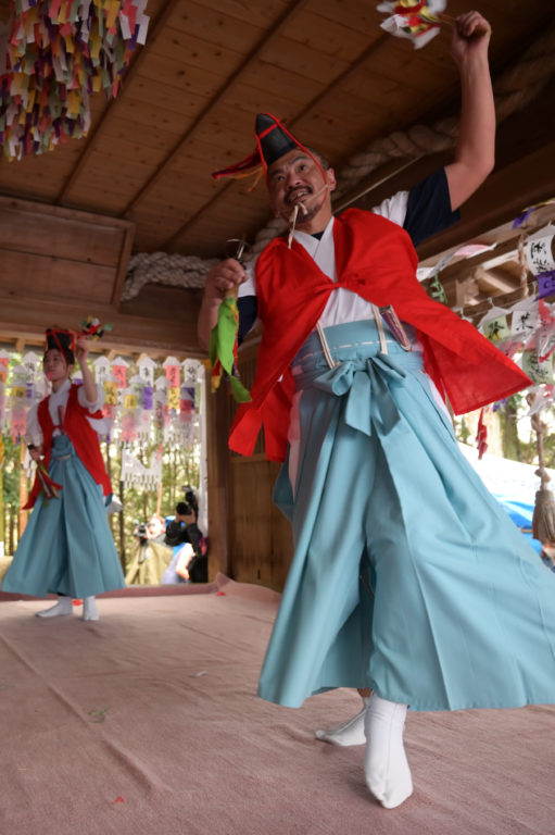 (作品に込めた思い:昨年の南山神社例大祭での一コマです。式太刀の演目中、刀を持ち回転する場面は、迫力があります。)