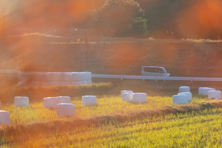 (作品に込めた思い:秋の圃場に並んだ干し草ロールが目に飛び込んできた。これらの季節感を加えて撮影するためにモミジの葉を前ボケにし、オレンジのフィルターをかけたような効果を出した。)