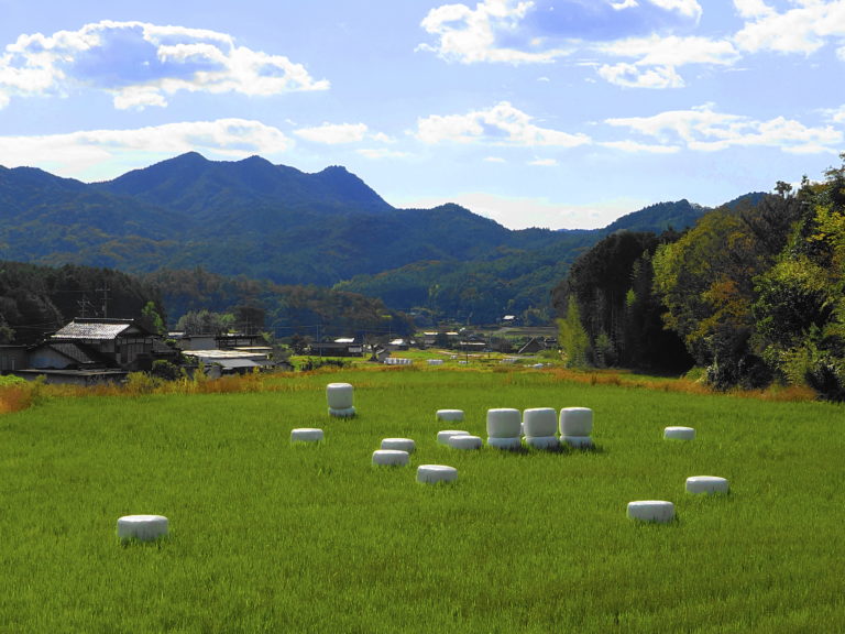 巨大な白いマシュマロ(稲ホールクロップサイレージ)の輝きと、家の屋根の輝きを見てほしいです。)
