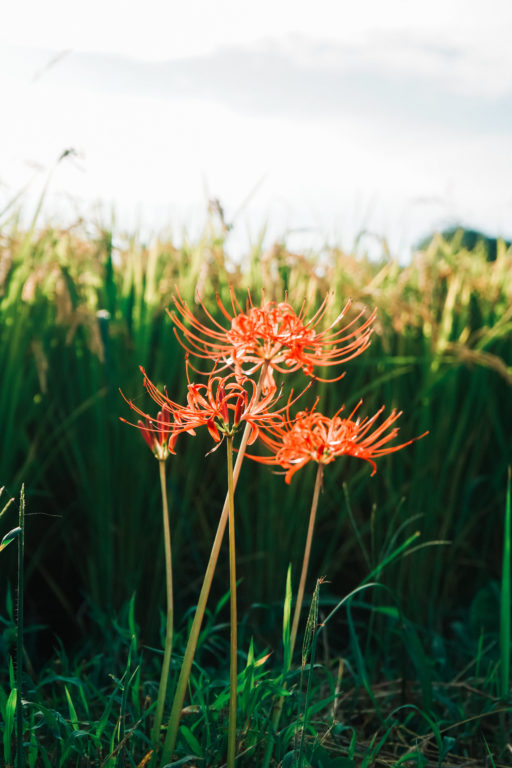 (作品に込めた思い:1週間ほどで枯れてしまう彼岸花が稲の横で朝日に当たって綺麗だったので撮りました。綺麗な伊陸の自然をみんなに知って欲しい。)