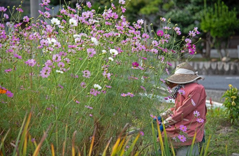 (作品に込めた思い:田舎道を走っているとコスモスと誰か人がいるように見え車を停めてシャッターを押しました。静かな里山を彩るコスモス畑に溶け込む案山子に癒されました。)